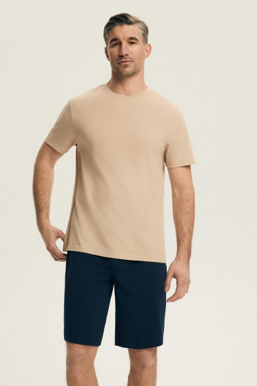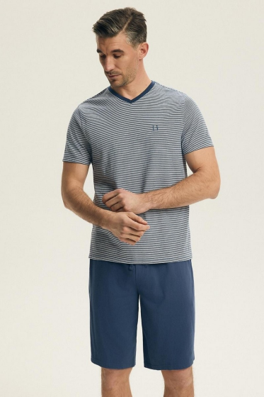 "description" => "Piżama, która łączy wygodę z codziennym stylem – idealna na wiosenne i letnie noce. Koszulka w jasnoniebieskim kolorze została ozdobiona subtelnymi, wielokolorowymi, cienkimi paskami, które nadają jej świeży, młodzieńczy charakter. Dekolt w serek z miękkim wykończeniem gwarantuje wygodne dopasowanie i komfort noszenia przez całą noc. Uzupełnieniem kompletu są gładkie, krótkie spodenki w klasycznym, stonowanym kolorze – lekkie, przewiewne i idealne na cieplejsze dni. Całość wykonana z wysokogatunkowej bawełny i elastycznej dzianiny – by każda noc była pełna swobody i komfortu.Skład: Koszulka: 85% bawełna, 15% poliester."