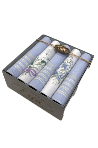 "description" => "Chusteczki damskie , wykonane z delikatnie tkanej bawełny , dwie sztuki ozdobione delikatnym, kwiatowym haftem , pakowane po pięć sztuki w eleganckie pudełko , różne zestawienia kolorystyczne, rozmiar 30x30 cm . Skład: 100% bawełna."
