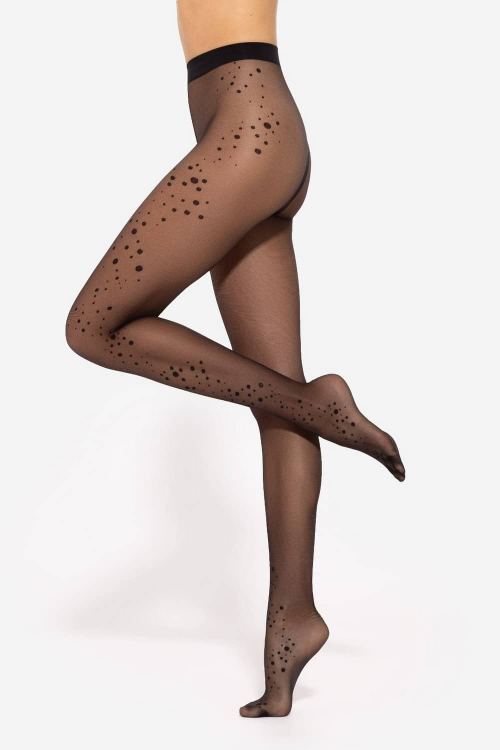 Rajstopy damskie 20 den wykonane z przędzy typu elastan oplatany, matowe, wzorzyste , delikatne wzmocnienia na palcach, bez zaznaczonej części majteczkowej, mały klin. Skład: 89% poliamid, 11% elastan.