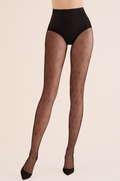 Fantazyjne rajstopy zdobione wzorem . Bez wydzielonej części majteczkowej. Skład: 85% poliamid, 15% elastan.