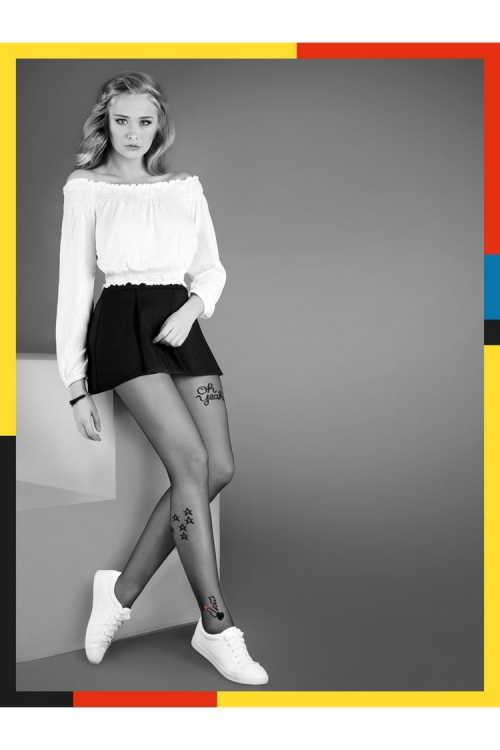 Ekskluzywne fantazyjne rajstopy wykonane z włókna Lycra podwójnie oplecionego jedwabiem poliamidowym. Bez wydzielonej części majteczkowej, z bawełnianym klinem, szyte płaskim szwem