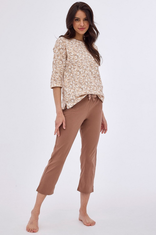 Piżama damska wysokiej jakości bawełna wzorzysta koszulka z rękawem 3/4 okrągły dekolt z jednolitą lamówką , spodnie jednolite długość 7/8 , w pasie wiązana satynowa tasiemka. Skład: 100% bawełna.