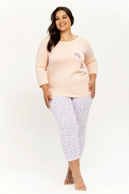 Piżama damska z rękawem długości 7/8, jednolita, na wysokosci klatki piersiowej nadruk. Do kompletu wzorzyste spodnie długości 7/8.Skład: 100% bawełna.