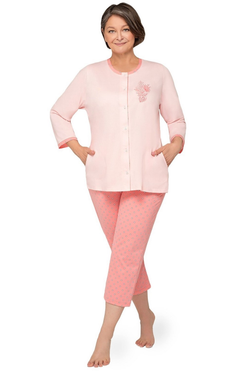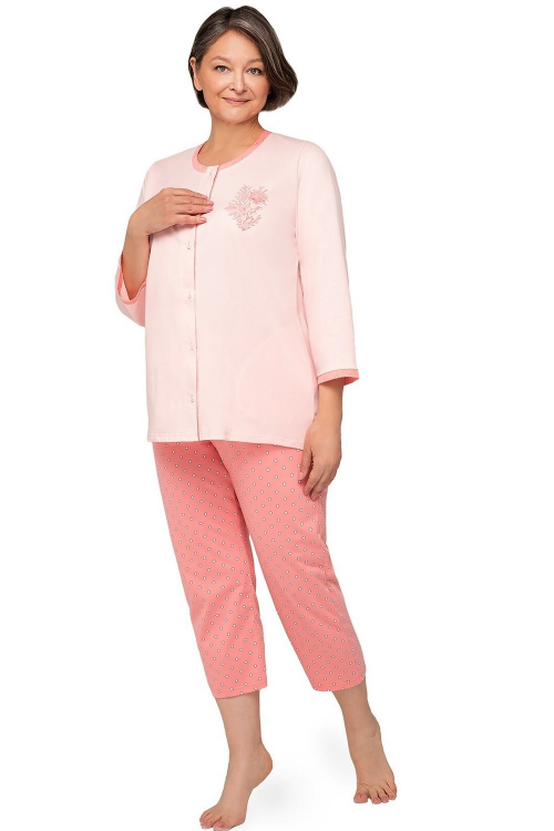 Piżama damska wykonana z delikatnej bawełny koszulka z rękawem 3/4 , dekolt i mankiety zdobione wzorzystą lamówką , półokrągły dekolt zapinany na guziki , wzorzyste spodnie o długości 3/4. Skład: 100% bawełna.