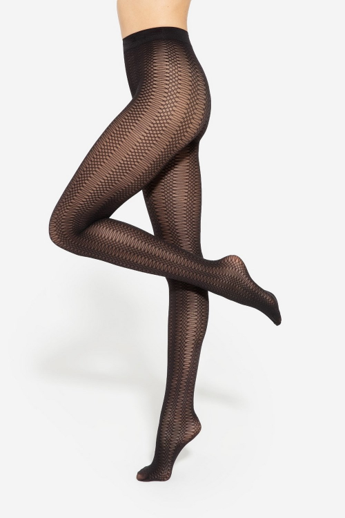 Rajstopy wzorzyste o wyjątkowej miękkości, wykonane z mikrofibry, matowe bez zaznaczonej; części majteczkowej z małym klinem. Skład 91% poliamid,9% lycra.