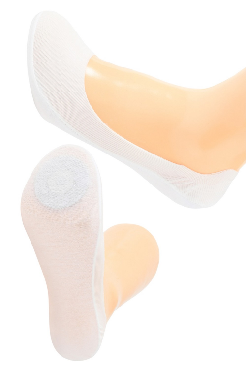 Balerinki damskie z silikonem na pięcie i ABS. Skład: wierzch- 85% nylon, 15 elastan; spód- 80% bawełna, 15% poliester, 5% elastan.