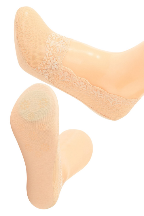 Balerinki damskie koronkowe z abs i silikonem dookoła stopy. Skład: wierzch - 85 nylon, 15% Elastan; spód - 80% Bawełna, 15% Poliester, 5% Elastan.