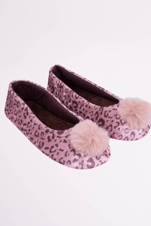 Baletki z materiału zdobionego panterką. Przód ozdobiony puszystym pomponem. Podeszwa biała, gumowana. Skład: 100% poliester; podeszwa 100% TPR.