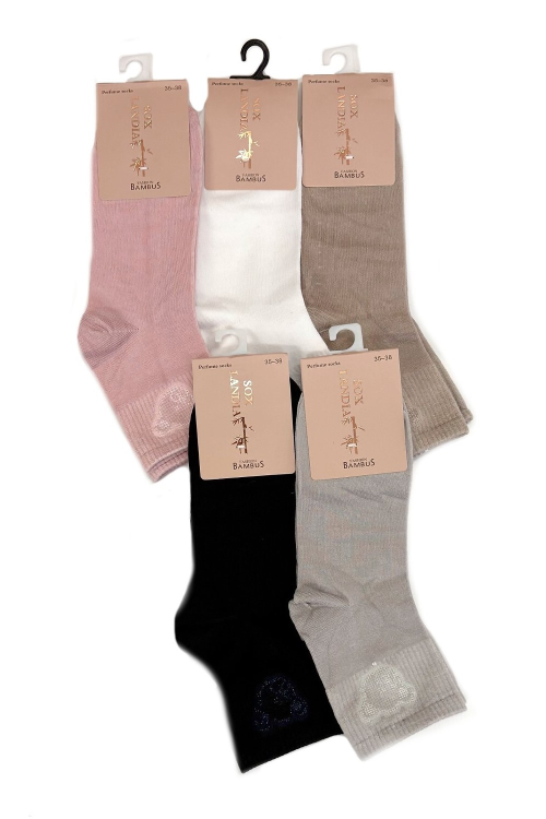Delikatne skarpety damskie , aromatyzowane , wykonane z włókna bambusowego , nieuciskający ściągacz ozdobiony wypukłym wzorem .Pakowane po 5 par jeden kolor i rozmiar. Skład: 95% bambus, 5% spandex.