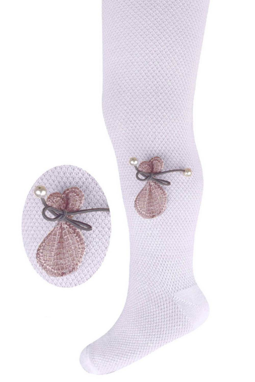 Rajstopy dziecięce bawełniane ażur z aplikacją. Skład: 80% bawełna, 17,5% poliamid, 2,5% elastan. Wystepują kolory: biały,ecri, beż ,róż , bordo, musztarda.