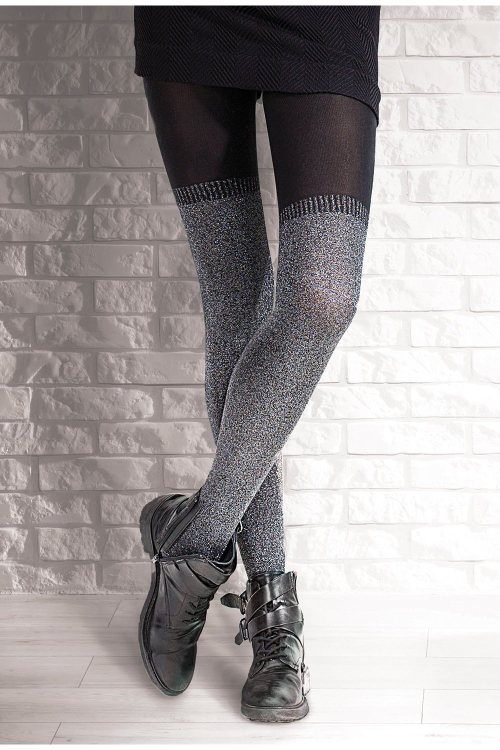 Rajstopy bawełniane damskie, wzorowane lurexem. Skład: 75%bawełna, 20% poliamid, 3% poliester, 2% elastan.