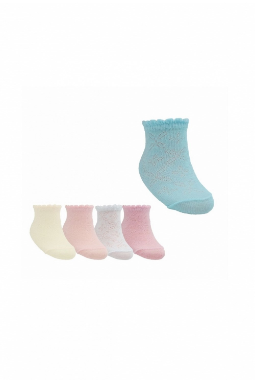 Bawełniane 80% skarpetki niemowlęce z dodatkiem włókien elastycznych, jednokolorowe zdobione żakardowym wzorem, z nieuciskającym ściągaczem.