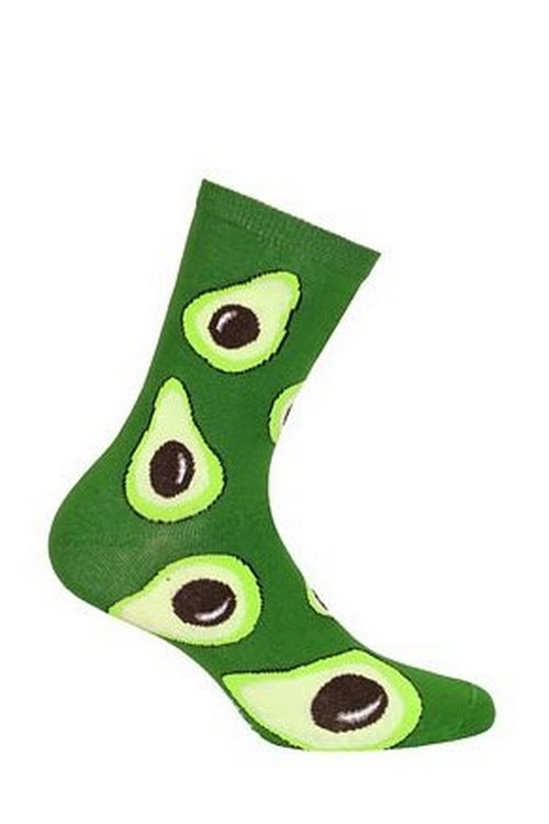 Skarpety damskie ozdobione kolorowym wzorem. Płaskie szwy, nieuciskający ściągacz.