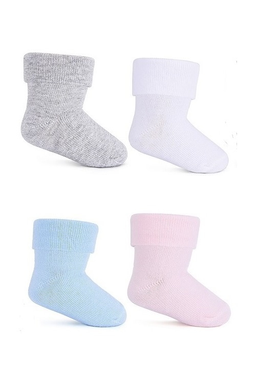 Skarpetki niemowlęce z wywijanym ściągaczem. Skład: 72% bawełna, 24% poliester, 4% elastan.