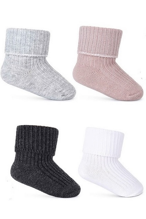 Skarpetki niemowlęce bezuciskowe wywijane. Skład: 72% bawełna, 24% poliester, 4% elastan.