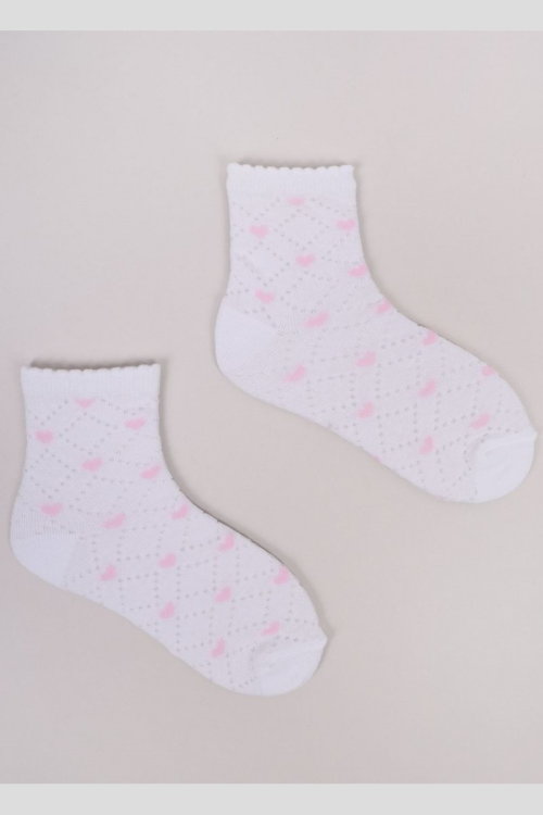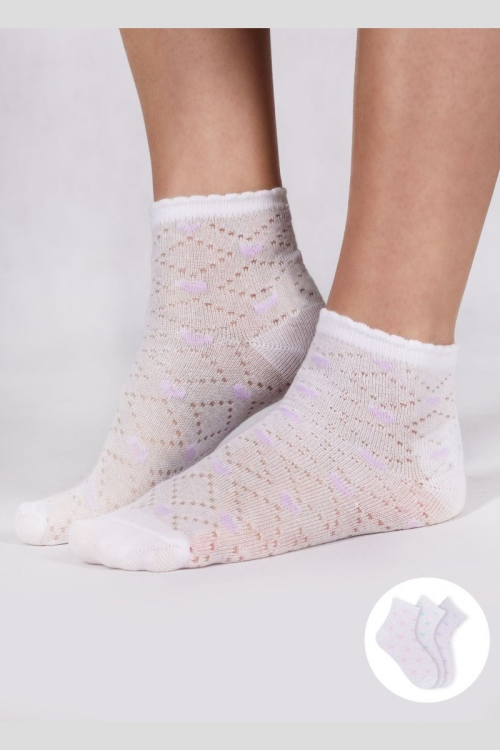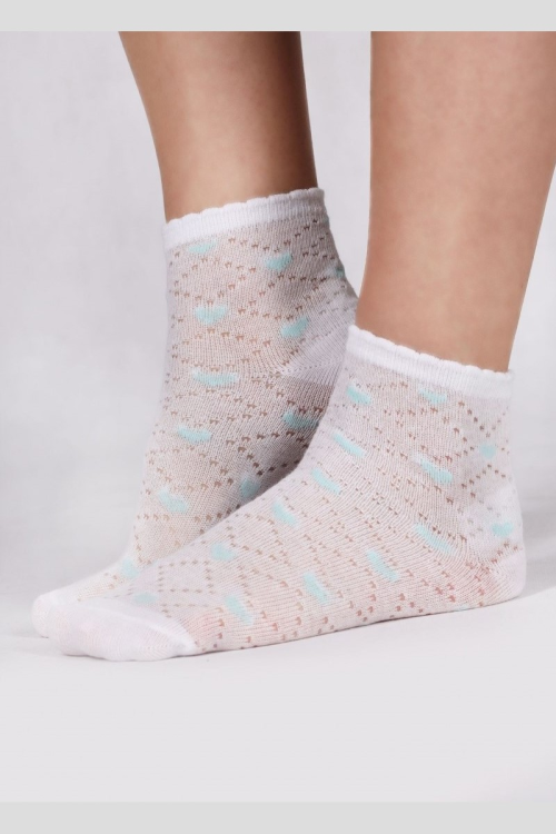 Dziewczęce skarpetki dostępne w kolorze białym, z motywem serduszek w trzech pastelowych kolorach.Delikatny ażurowy wzór nadaje im subtelnego, dziewczęcego uroku. Dzięki delikatnemu ściągaczowi u góry dobrze trzymają się na nodze, nie powodując ucisku. Skarpetki są miłe w dotyku, idealnie dopasowują się do nogi. Uszyte z miękkiego i zarazem wytrzymałego materiału, który gwarantuje duży komfort noszenia oraz przewiewność.Skład: 75% Bawełna 22% Poliamid 3% Elastan.Doskonale komponują się z sukienkami, spódniczkami, trampkami i eleganckim obuwiem, dodając stylizacji lekkości i uroku.