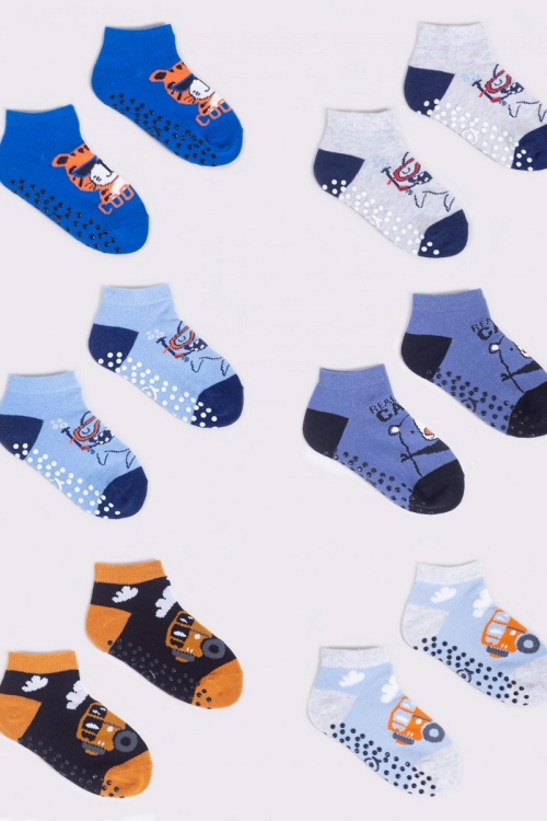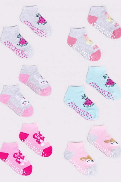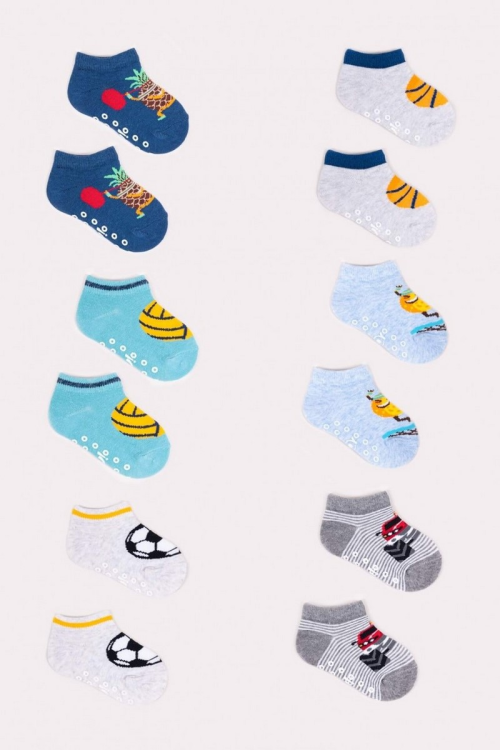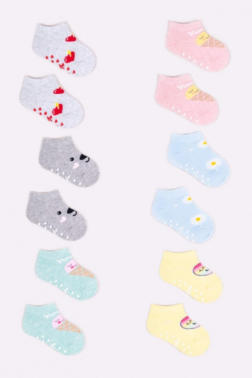 Dziecięce skarpety stopki dostępne w praktycznym sześciopaku. W różnych kolorach, zdziewczęcymi i chłopięcymi motywami. Na spodniej stronie znajduje się antypoślizgowa aplikacja w postaci kółeczek, która gwarantuje dobrą przyczepność do podłogi. Dzięki temu Twoje dziecko będzie mogło bezpiecznie poruszać się nawet po śliskich powierzchniach. Skarpety są miłe w dotyku, dobrze układają się na stopie. Dzięki elastycznemu ściągaczowi nie upijają nóżki dziecka. Sprawdzą się idealnie do codziennego noszenia.Skład: 80% Bawełna 15% Poliamid 5% Elastan .
