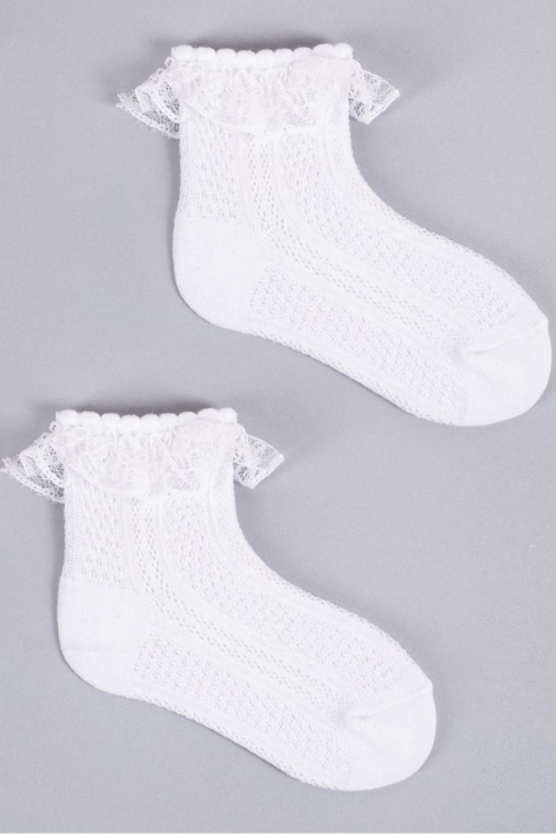 Ażurowe skarpetki dziewczęce wykonane z delikatnej bawełny. Ściągacz ozdobiony koronką. Skład: 73% bawełna, 22% poliamid, 5% elastan.