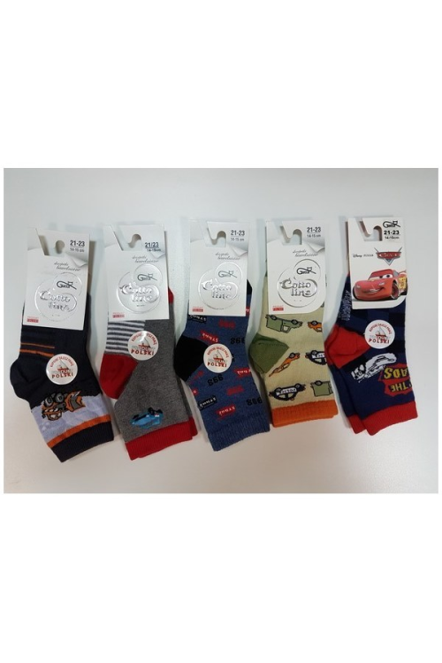 Wzorzyste, skarpetki dziecięce z wysokiej jakości cienkiej bawełny z dodatkiem włókien elastycznych. Wygodny, nieuciskający ściągacz. Skład uzależniony od wzoru: bawełna 83-85%, poliamid 10%, polipropylen 3-5%, elastan 2%.