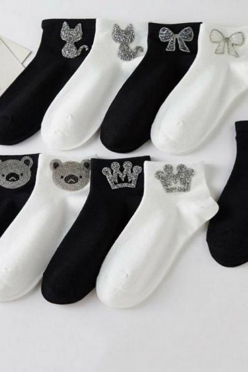 Delikatne zakostki damskie, wykonane z bawełny, nieuciskający ściągacz ozdobiony wzorem z cyrkonii i połyskujących kamyczków. 5 PAR/OP, kolor biały lub czarny, mix wzorów w ozdobach. Skład: 95% bawełna, 5% spandex.
