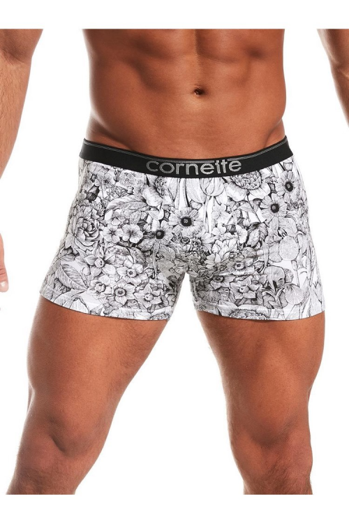 Wzorzyste bokserki męskie z wysokiej jakości bawełny 95% i dodatku elastanu. Model dopasowany do ciała, w pasie szeroka guma w kontrastującym kolorze z napisem . Płaskie łączenie szwów, bezuciskowe wykończenie nogawek.