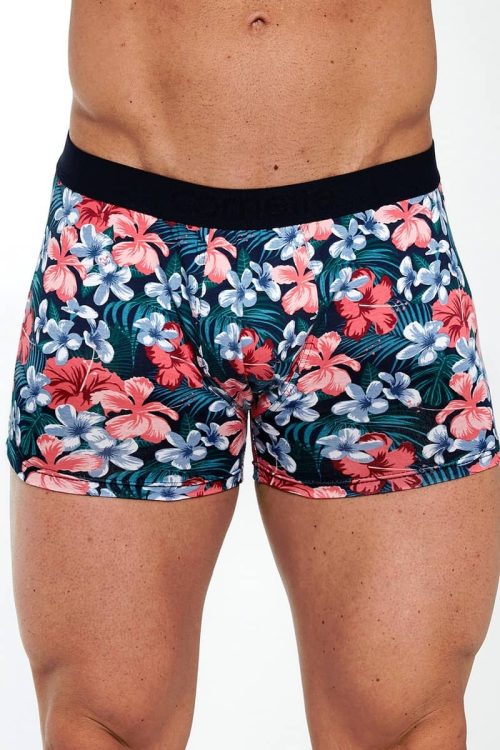 Wzorzyste bokserki męskie z wysokiej jakości bawełny 95% i dodatku elastanu. Model dopasowany do ciała, w pasie szeroka guma z napisem . Płaskie łączenie szwów, bezuciskowe wykończenie nogawek.