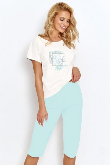 "description" => "Piżama damska , wysokiej jakości bawełna, koszulka z krótkim rękawem, z roślinnym printem , dekolt półokrągły, spodnie jednolite, długość 3/4 w pasie gumka obszyta bawełną. Skład: 100% bawełna."