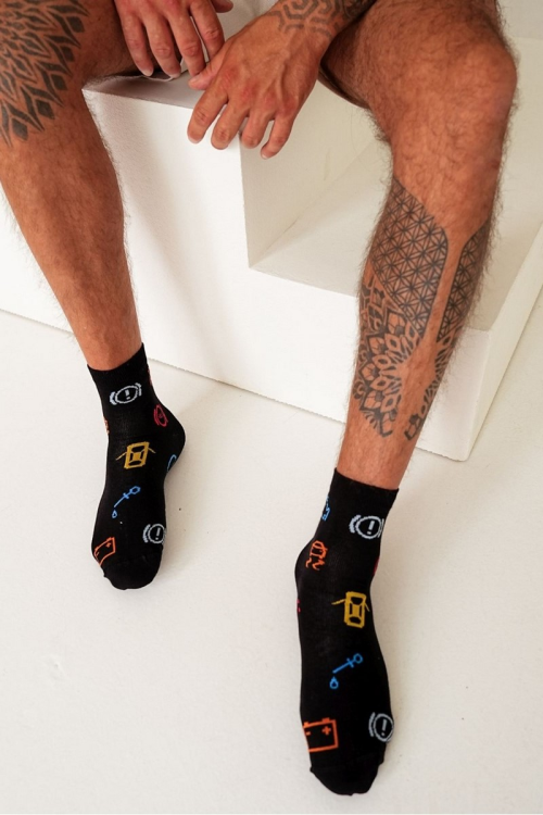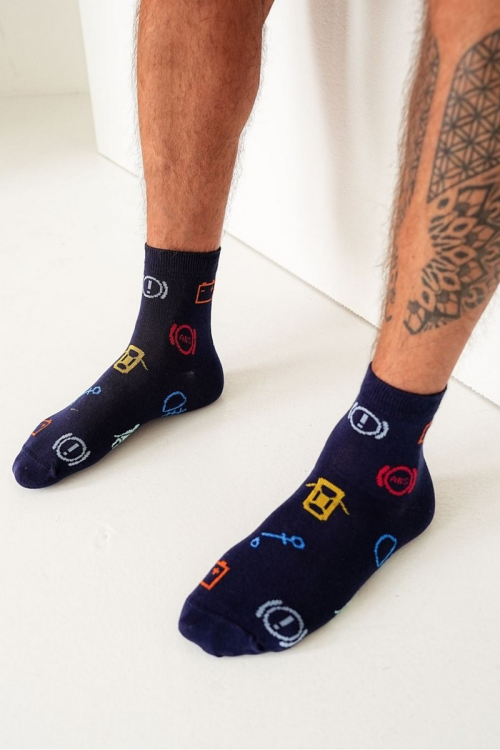Skarpety męskie wzorzyste. Płaski szew, nieuciskający ściągacz. Skład: 75% bawełna, 20% poliamid, 5% elastan