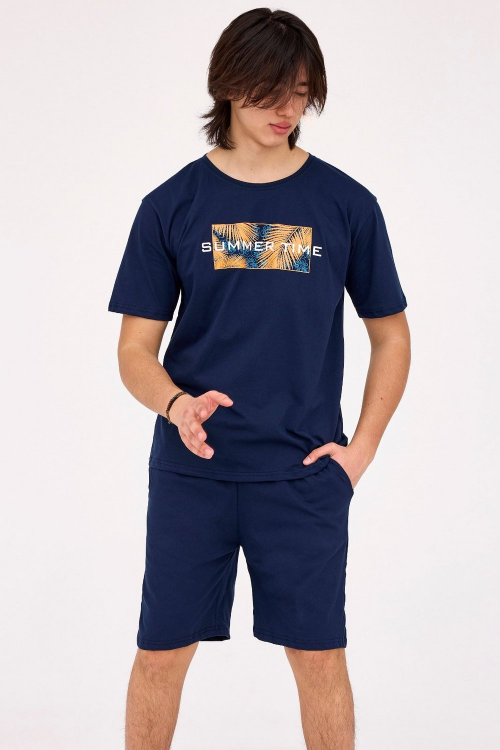 Letnia piżama młodzieżowa wysokiej jakości miękka bawełna koszulka z krótkim rękawem ozdobiona kolorowym nadrukiem krótkie, jednolite spodenki , długość do kolan. W pasie wygodna gumka po bokach wygodne kieszenie, pakowana w pudełko. Skład: 100% bawełna.
