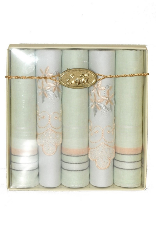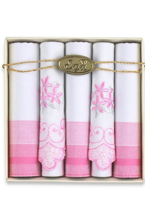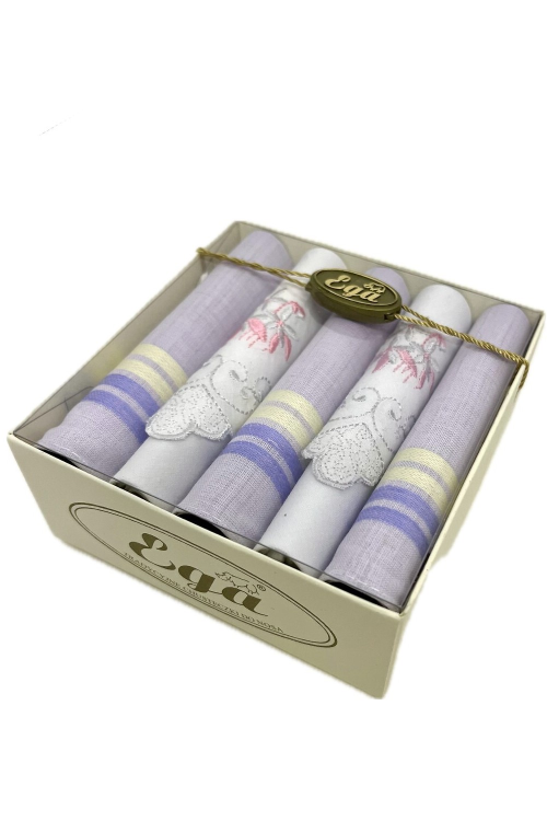 Chusteczki damskie , wykonane z delikatnie tkanej bawełny , dwie sztuki ozdobione delikatnym, kwiatowym haftem , pakowane po pięć sztuki w eleganckie pudełko , różne zestawienia kolorystyczne, rozmiar 30x30 cm . Skład: 100% bawełna.