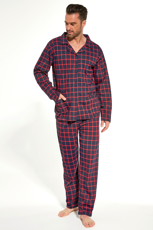 Klasyczna piżama męska uszyta z delikatnej bawełny w kratę. Piżama z długim rękawem, rozpinana, na wysokości bioder kieszenie. Do kompleru długie spodnie z prostymi nogawkami. Piżama pakowana w pudełko.Skład: 100% bawełna.
