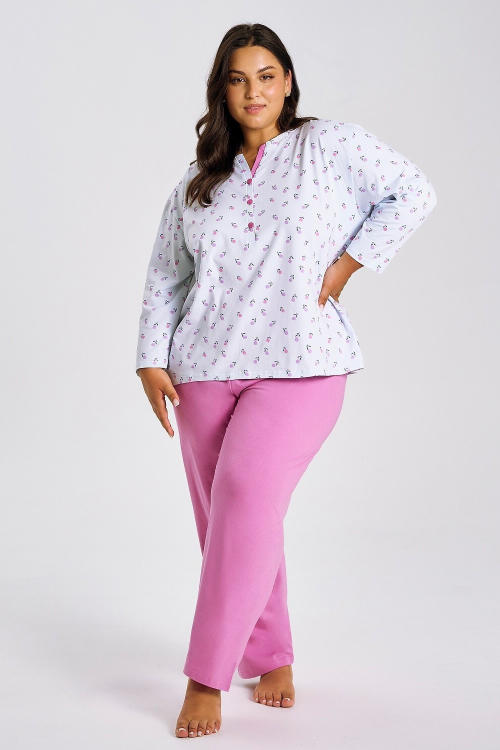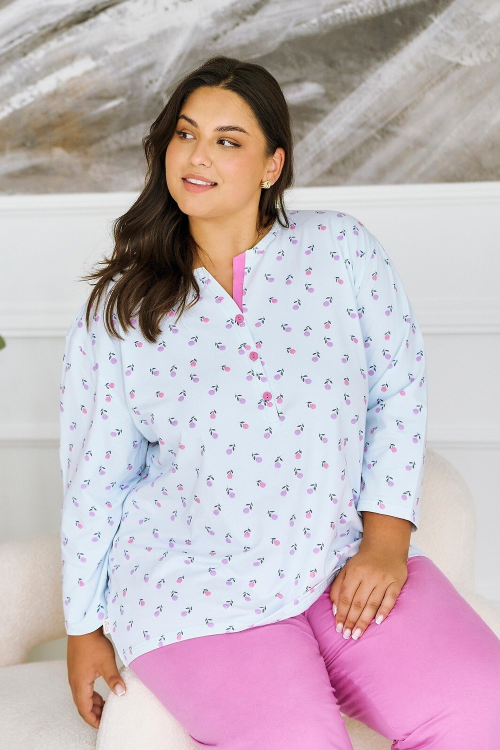 Piżama damska , koszulka z wzorzystej wiskozy , rękaw 7/8 , dekolt zapinany na guziki , spodnie długie, z jednolitej bawełny. Skład: koszulka 94% wiskoza, 6% elastan; spodnie 100% bawełna.