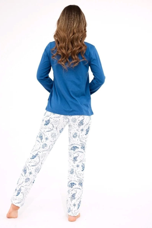 Stylowa piżama damska w odcieniu jeansu z wyjątkowym nadrukiem . Ta dwuczęściowa piżama to połączenie wygody, stylu i delikatnych detali, które tworzą wyjątkową całość. Góra w kolorze głębokiego, jeansowego błękitu ozdobiona została subtelnym sitodrukiem z napisem „Good night” i uroczym księżycem – idealne na wieczorny relaks i spokojny sen. Do kompletu dołączone są długie, proste spodnie bez kieszeni, wykonane z lekkiej, miękkiej bawełny. Nadruk inspirowany motywami słońca oraz tygrysów nadaje im unikalnego, artystycznego charakteru, który przyciąga uwagę, a jednocześnie nie przytłacza.Skład: 100% bawełna.