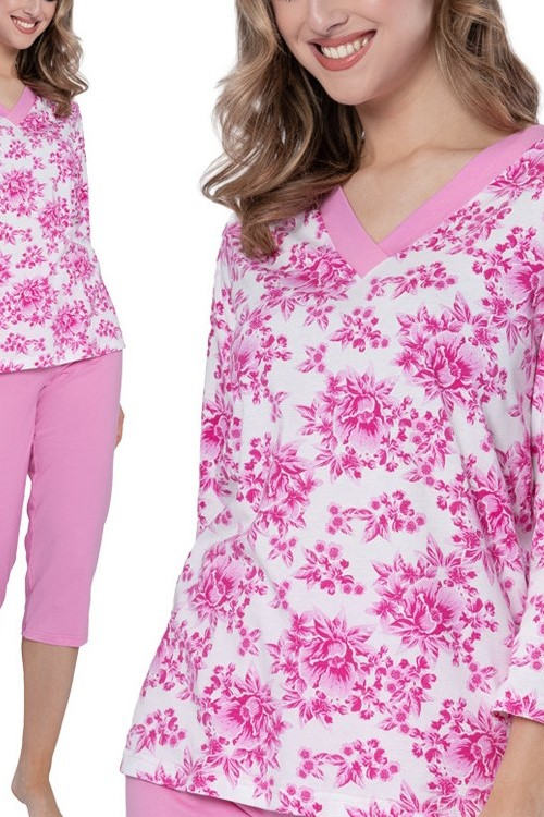 Szukasz piżamy, która łączy wygodę z wyjątkowym stylem? Model Martyna to idealne rozwiązanie dla kobiet, które pragną czuć się pięknie i komfortowo – bez kompromisów. To zestaw, który zasługuje na uwagę dzięki starannie dobranym detalom i zachwycającemu, kwiatowemu wzorowi. Bluzka z rękawami 7/8 oraz dekoltem w szpic, podkreślonym kontrastową plisą, nie tylko wysmukla sylwetkę, ale też dodaje całości elegancji i nowoczesnego charakteru. Spodnie o długości 3/4 zostały zaprojektowane tak, by pięknie układały się na sylwetce, nie krępując przy tym ruchów. Uszyta z wysokiej jakości materiału (100% bawełna), piżama Martyna jest nie tylko stylowa, ale i niezwykle przyjemna w noszeniu – przewiewna, miękka i idealna na każdą porę roku.
