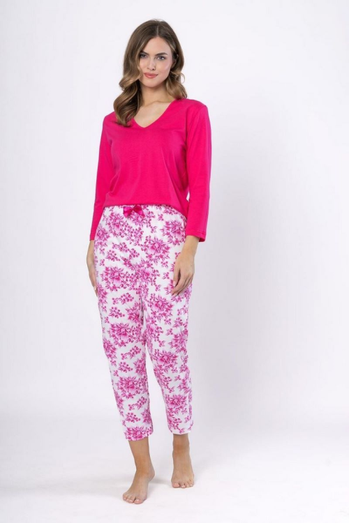 Piżama damska , wysokiej jakości bawełna , koszulka jednolita, z rękawem 7/8 , dekolt "V" , spodnie wzorzyste, z nogawką 7/8 w pasie satynowa kokardka , na biodrach wygodne kieszenie . Skład: 100% bawełna.