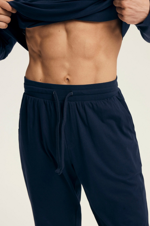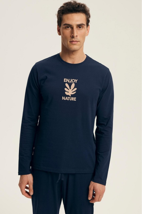 Bawełniana piżama męska , bluza z długim rękawem , dekolt okrągły z przodu stylowy nadruk , do kompletu długie spodnie w pasie szeroka, wygodna guma z regulowanym troczkiem, na biodrach kieszenie , nogawki zakończone ściągaczem , pakowana w pudełko .Skład: 100% bawełna .