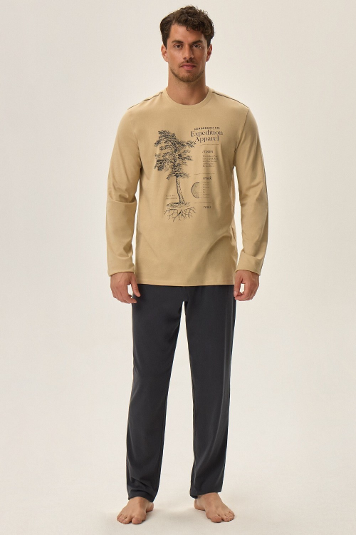 Piżama męska wysokiej jakości bawełna bluza z długim rękawem półokrągły dekolt z przodu oryginalny nadruk , spodnie długie w kontrastującym kolorze w pasie guma obszyta bawełną .Skład: 100% bawełna.