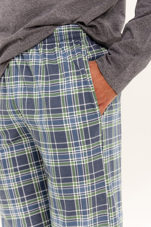 Bawełniana piżama męska , bluza z długim rękawem , dekolt okrągły , na piersi mały napis , spodnie długie, w kratkę , po bokach wygodne kieszenie . Skład: koszulka92% bawełna, 8% poliester; spodnie 100%.