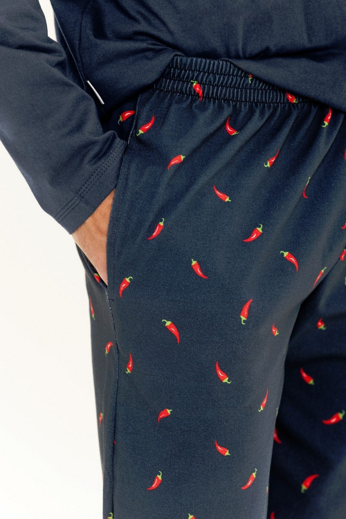 Bawełniana piżama męska , bluza jednolita, z długim rękawem , dekolt półokrągły , na piersi mały nadruk , długie spodnie, print w czerwone papryczki na biodrach wygodne kieszenie , nogawki zakończone ściągaczem . Skład: 100% bawełna.