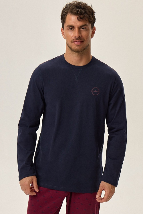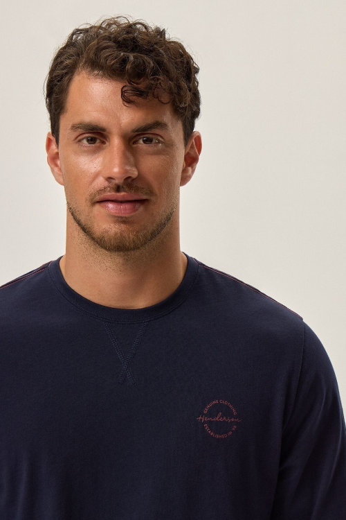 Bawełniana piżama męska bluza z długim rękawem dekolt okrągły na piersi mały nadruk , spodnie długie, wzorzyste w pasie szeroka guma zewnętrzna z napisem HENDERSON. Skład: 100% bawełna.