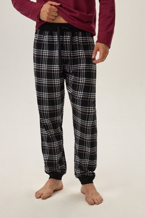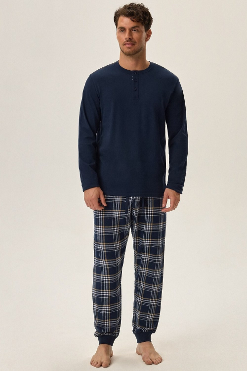 Bawełniana piżama męska , koszulka jednolita, z długim rękawem, dekolt zapinany na trzy guziczki, spodnie długie w kratkę, z miłej flaneli, nogawki i pas obszyte ściągaczem. Skład: 100% bawełna.