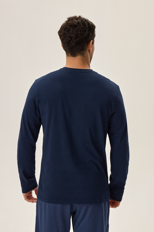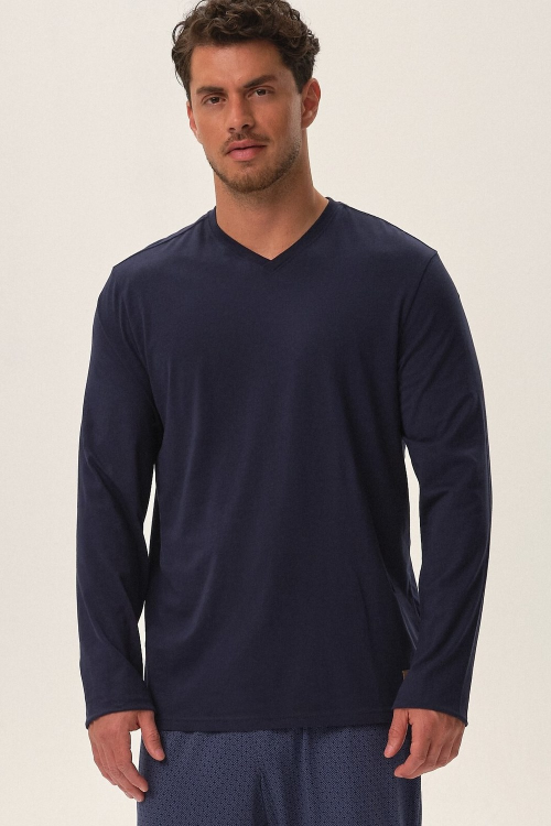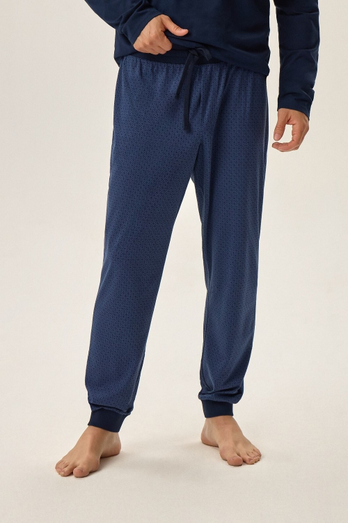 Bawełniana piżama męska bluza z długim rękawem , dekolt w kształcie litery "V" na boku mała naszywka , spodnie długie, wzorzyste w pasie ściągacz z troczkami do wiązania. Skład: 100% bawełna.