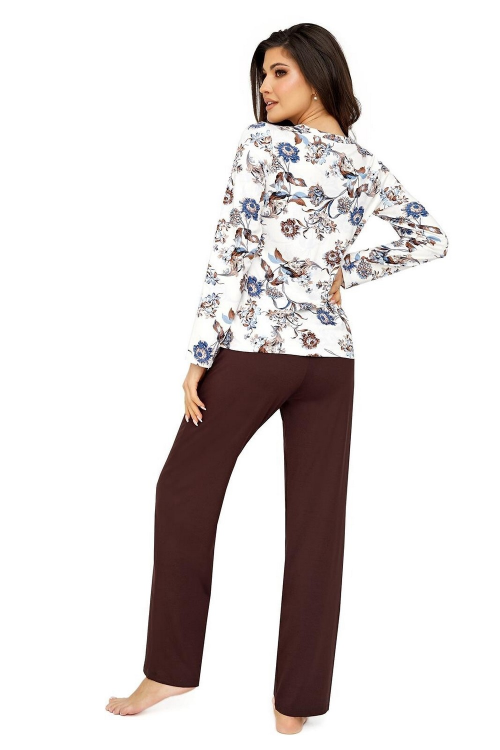 Piżama damska delikatna wiskoza , koszulka o kwiatowym motywie, długi rękaw dekolt w kształcie litery "V", długie spodnie luźny, prosty krój. Pakowana w foliowy woreczek. Skład: 95% wiskoza, 5% elastan.