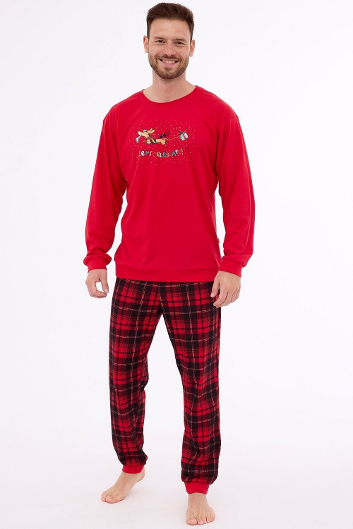 Piżama męska wysokiej jakości bawełna, koszulka z długim rękawem z przodu kolorowy nadruk ze świątecznym motywem , spodnie długie w kratkę w pasie gumka , mankiety, dół koszulki i nogawki zakończone ściągaczem. Pakowana w pudełko. Skład: 100% bawełna.