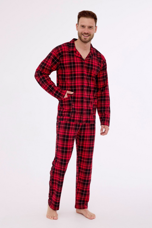 Piżama męska, rozpinana wysoka jakość bawełny , bluza w kratę długi rękaw z kołnierzykiem, z kieszeniami , spodnie długie. Skład: 100% bawełna.