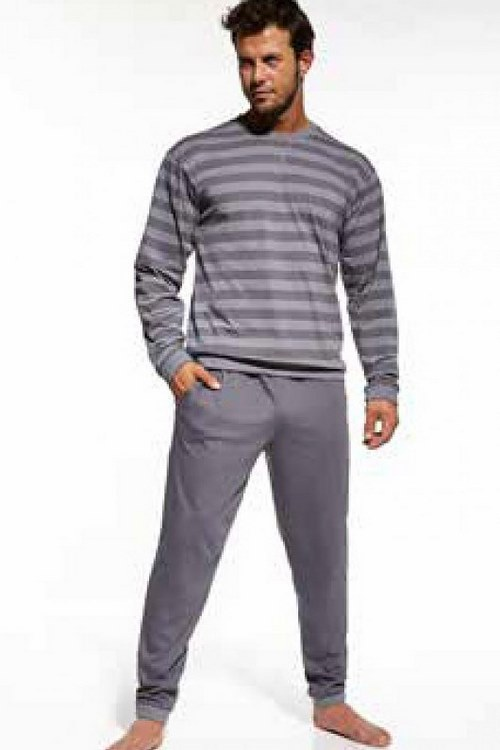 Piżama męska długa. Koszulka zakończona ściągaczami wykonana z bawełny w paski jeansowo-granatowe. Spodnie wiązane w pasie. Skład: 92% bawełna 8% poliester.