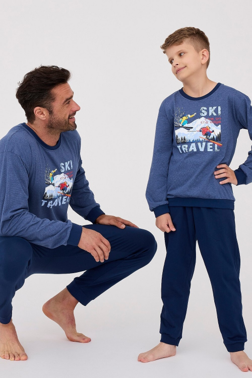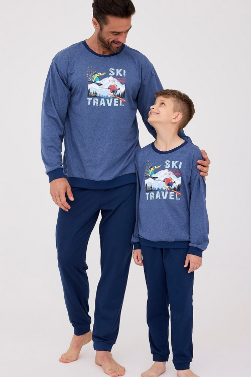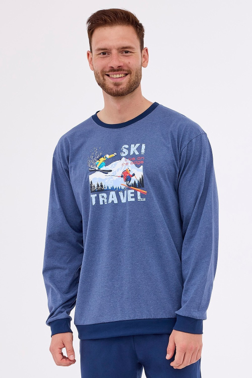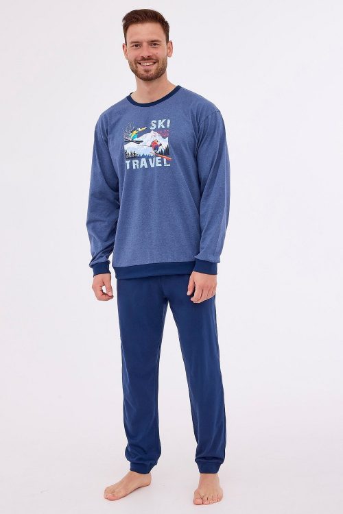 Piżama męska wysokiej jakości bawełna bluza z długim rękawem z przodu kolorowy nadruk , spodnie z długą nogawką, jednolite- w pasie gumka , mankiety, dół koszulki i nogawki zakończone ściągaczem. Pakowana w pudełko. Skład: koszulka 80% bawełna, 20% poliester; spodnie 100% bawełna.