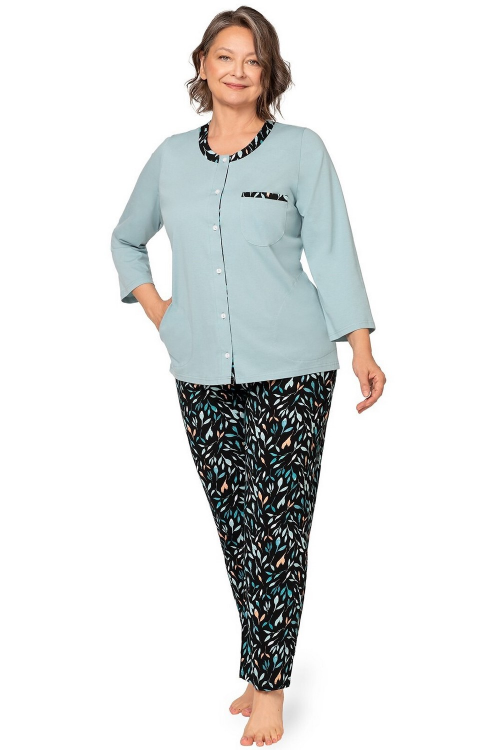 Piżama damska , wykonana z delikatnej bawełny , koszulka jednolita, zapinany na guziki , wzorzysty dekolt , rękaw 7/8 na piersi naszyta kieszonka , po bokach wsuwane kieszenie , spodnie długie, wzorzyste. Skład: 100% bawełna.