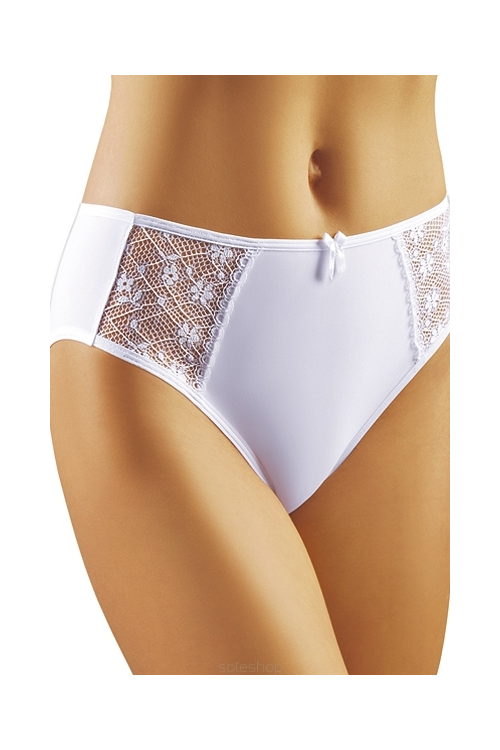 Figi damskie o klasycznym fasonie wykonane z przyjemniej dla skóry i zarazem wytrzymałej mikrofibry. Boki ozdobione koronką, z przodu delikatna kokardka nadająca majtkom dodatkowego uroku.Skład: 82% poliamid, 18% elastan