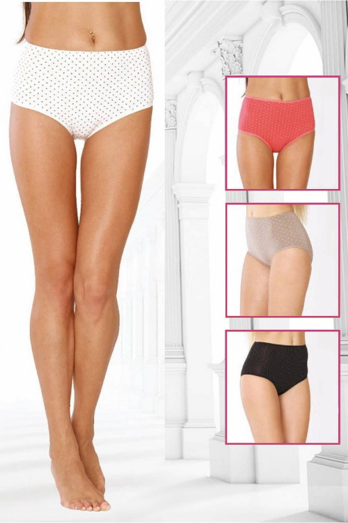 Wysokie figi damskie, zabudowane na biodrach, jednolite lub ozdobione wzorem w kropki.